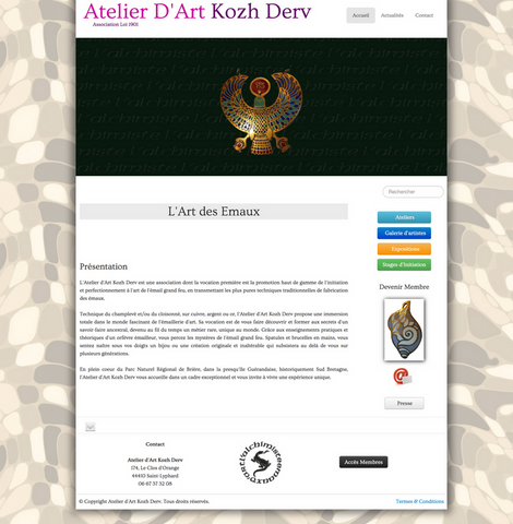 A l'initiative de l'Alchimiste, artiste orfèvre-émailleur d'art, est créé sous le statut d'association loi 1901, l'Atelier d'Art Kozh Derv, dont la vocation première est la promotion haut de gamme de l'initiation et perfectionnement à l'art de l'émail grand feu, en transmettant les plus pures techniques traditionnelles de fabrication des émaux.